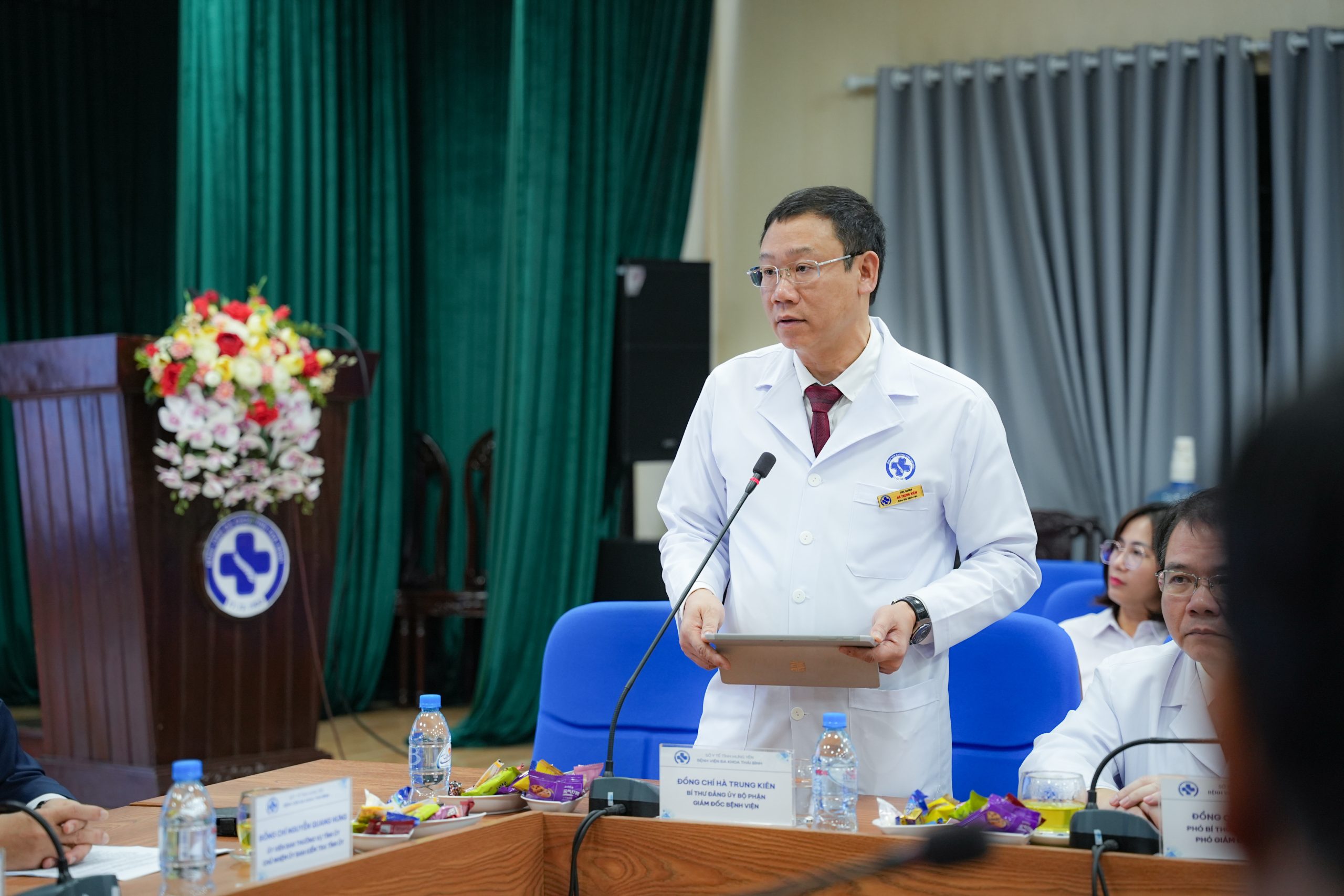 Tại hội nghị, TTƯT. BSCKII. Hà Trung Kiên, Bí thư Đảng ủy, Giám đốc Bệnh viện đã báo cáo khái quát về kết quả Bệnh viện đạt được trong sự nghiệp chăm sóc và bảo vệ sức khỏe nhân dân. Bệnh viện Đa khoa Thái Bình với bề dày lịch sử hơn 120 năm xây dựng và trưởng thành, từ một nhà thương nhỏ bé, đến nay Bệnh viện đã trở thành Bệnh viện đạt cấp chuyên sâu về chuyên môn kỹ thuật, quy mô 1500 giường bệnh với 46 khoa, phòng, trung tâm. Năm 2025, Bệnh viện tích cực triển khai các giải pháp, hoàn thành tốt chỉ tiêu kế hoạch đặt ra, giữ vững vai trò là Bệnh viện đầu ngành tuyến tỉnh. Bệnh viện đã thực hiện khám 349.490 lượt, điều trị nội trú 96.841 lượt, phẫu thuật 16.168 lượt. Triển khai 27 kỹ thuật mới, trong đó có nhiều kỹ thuật cao như cấy máy tạo nhịp tim CRT, ICD, vi phẫu tái tạo xương hàm… Nâng cao chất lượng chăm sóc điều trị, đổi mới phong cách, thái độ phục vụ hướng đến sự hài lòng người bệnh. Qua đó, giúp người dân được tiếp cận dịch vụ y tế kỹ thuật cao ngay tại địa phương, góp phần giảm rõ rệt tỷ lệ chuyển tuyến.