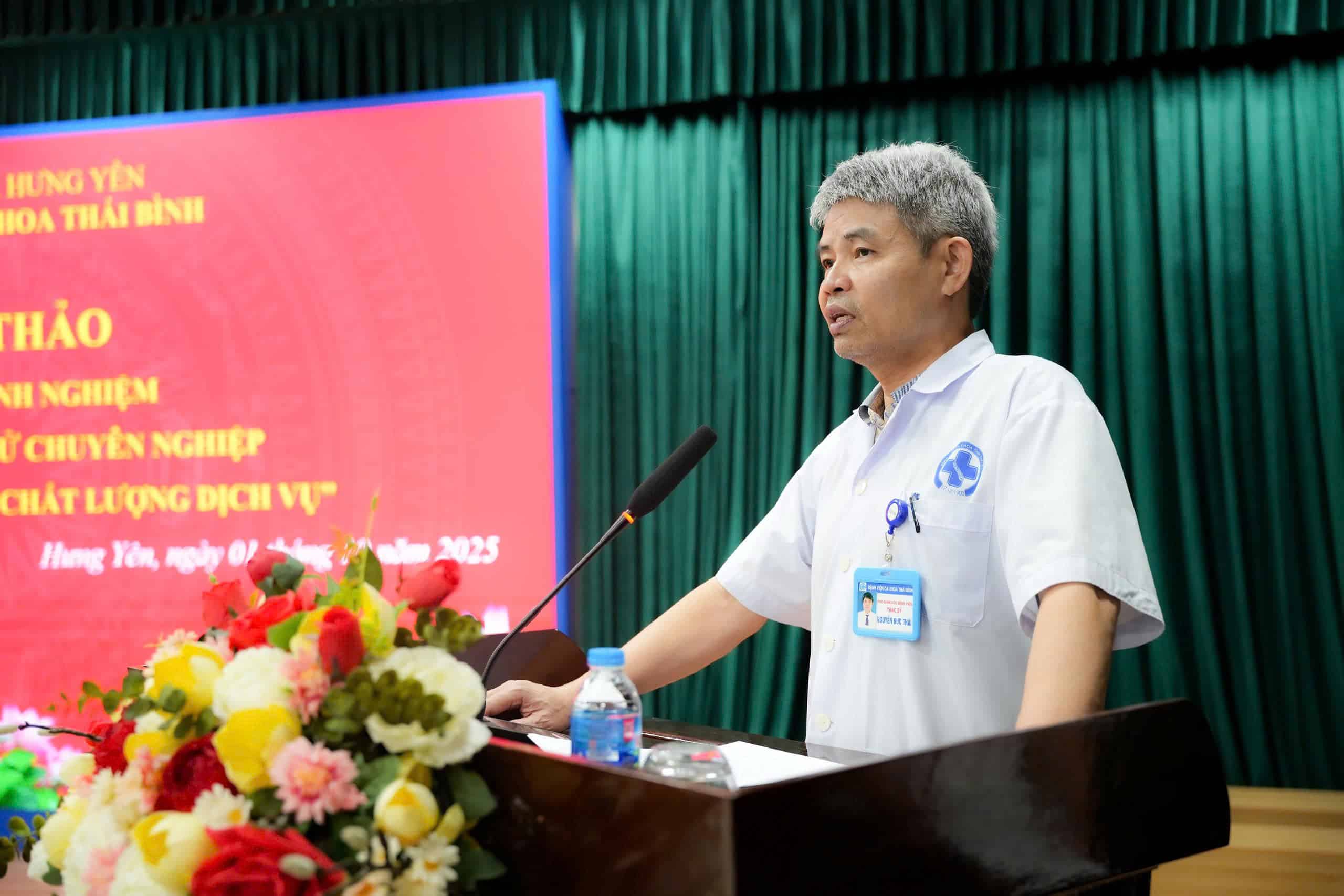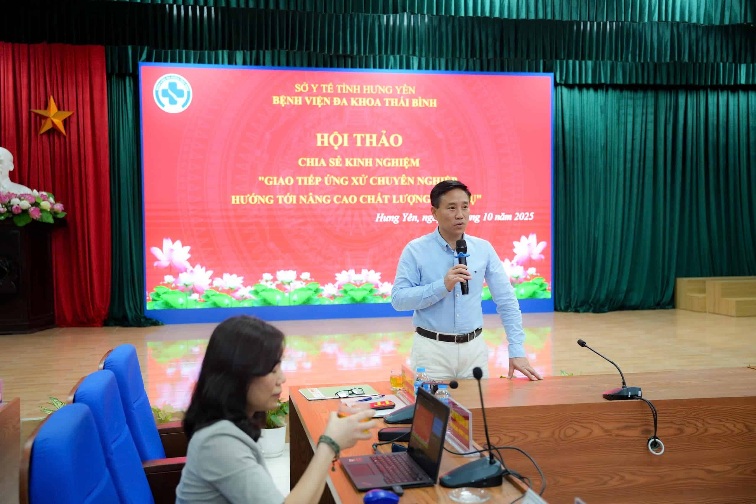 Phát biểu khai mạc Hội thảo, Ths.Bs. Nguyễn Đức Thái – Phó giám đốc Bệnh viện chia sẻ: Thay đổi phong cách thái độ, hướng đến sự hài lòng của người bệnh là một trong những mục tiêu quan trọng mà Bệnh viện Đa khoa Thái Bình hướng đến, vì vậy, Bệnh viện thường xuyên tổ chức các lớp tập huấn, hội thảo chia sẻ kinh nghiệm về giao tiếp ứng xử để nhân viên y tế có cơ hội cập nhật thêm nhiều kiến thức, kỹ năng mới. Đồng chí hy vọng, sau buổi hội thảo này, các cán bộ, nhân viên y tế của Bệnh viện sẽ có những thay đổi tích cực trong nhận thức, hành vi để phù hợp với yêu cầu công việc đặt ra, góp phần nâng cao hơn nữa chất lượng Bệnh viện.