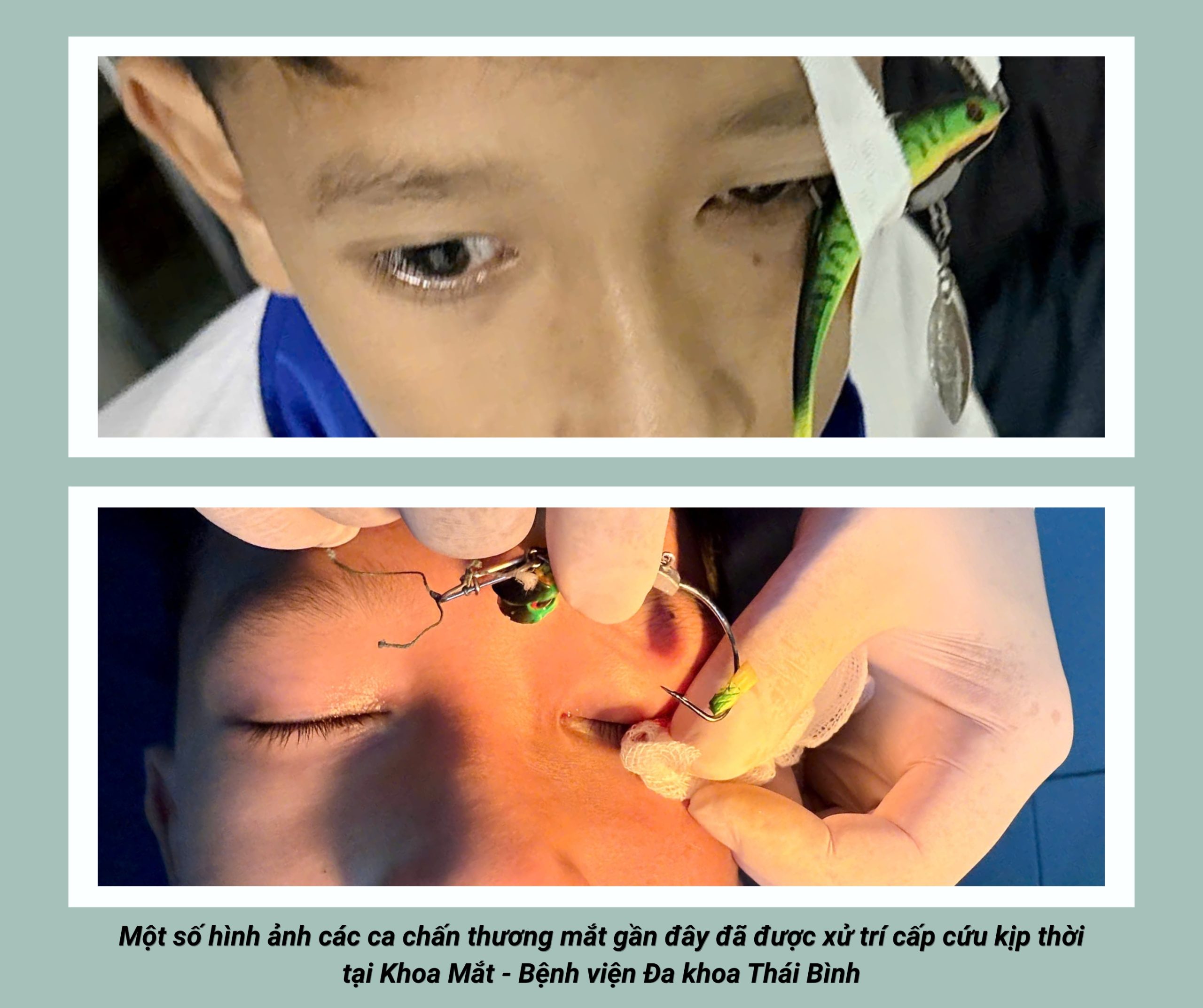 Thời gian gần đây, các bác sĩ Khoa Mắt – Bệnh viện Đa khoa Thái Bình đã tiếp nhận một số trường hợp trẻ em bị chấn thương mắt nghiêm trọng do móc câu cá trong dịp Tết. Tai nạn xảy ra khi trẻ đứng gần người lớn đang quăng cần, lưỡi câu bật ngược, cắm sát vùng nhãn cầu. Bệnh nhi nhập viện trong tình trạng đau nhức, sưng nề mi, nguy cơ tổn thương nhãn cầuảnh hưởng thị lực lâu dài. Ngay sau đó, bệnh nhi đã được các bác sĩ Khoa Mắt xử trí cấp cứu kịp thời. Tuy nhiên, do tổn thương phức tạp và nằm sát nhãn cầu, bệnh nhân vẫn cần theo dõi lâu dài nguy cơ ảnh hưởng thị lực.