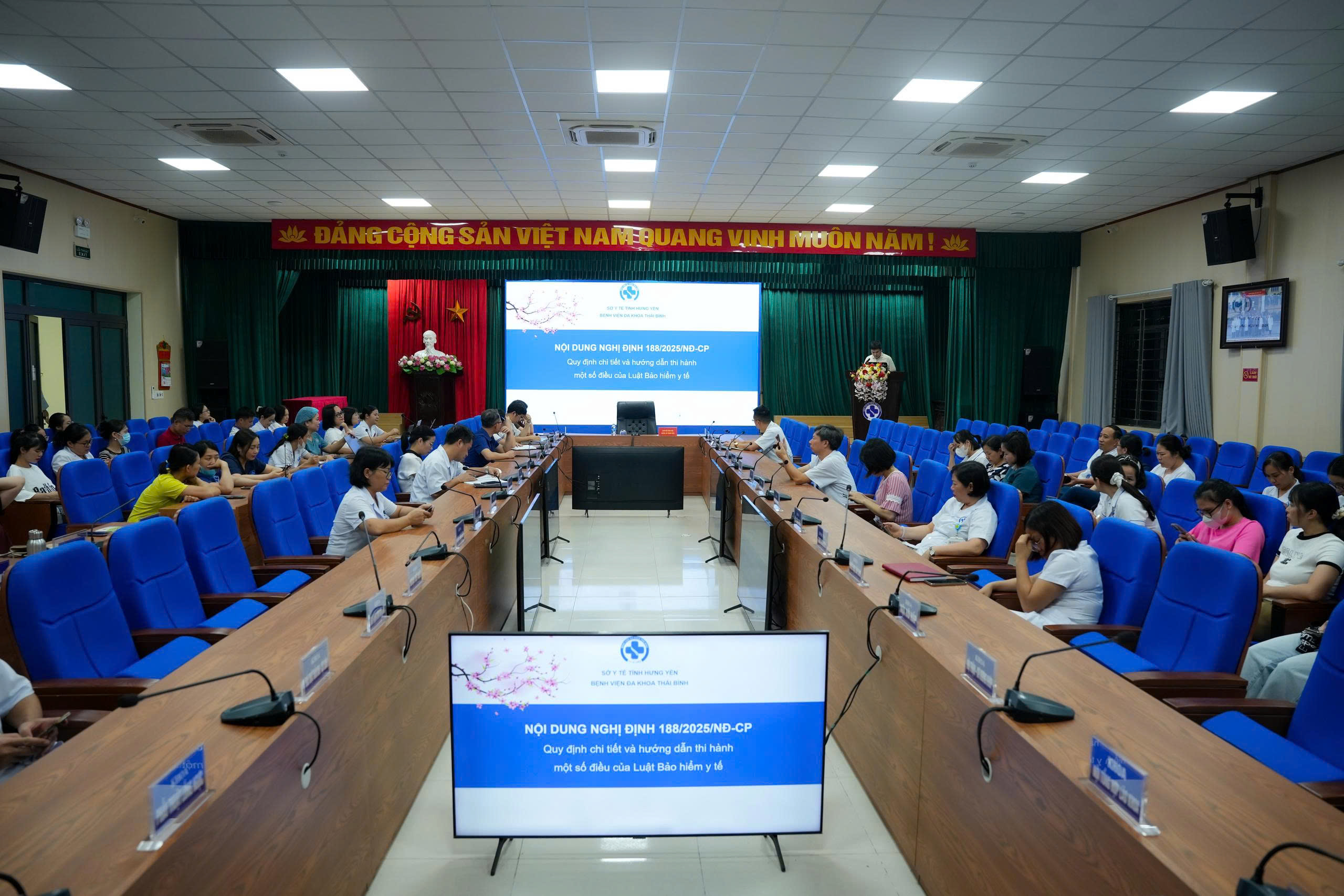 Chiều ngày 18/7/2025, Bệnh viện Đa khoa Thái Bình tổ chức tập huấn triển khai Nghị định số 188/2025/NĐ-CP ngày 01/7/2025 của Chính phủ, quy định chi tiết và hướng dẫn thi hành một số điều của Luật Bảo hiểm y tế (BHYT). Hội nghị có sự tham gia của TTƯT.TS.BS. Nguyễn Thị Thanh Trung, Phó Giám đốc Bệnh viện cùng đại diện lãnh đạo, nhân viên y tế tại các khoa, phòng, trung tâm.