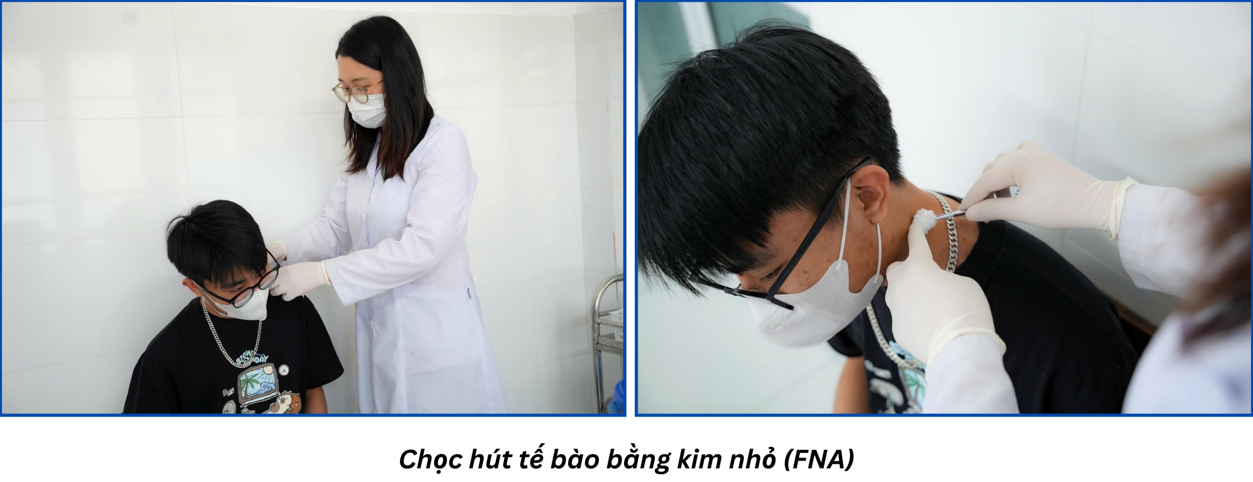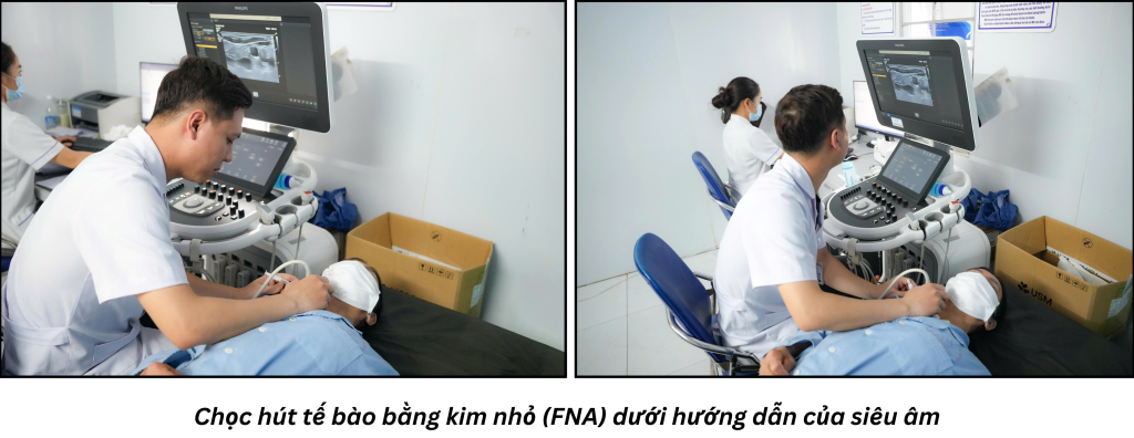 - Chọc hút tế bào bằng kim nhỏ (FNA): Là phương pháp quan trọng nhất để chẩn đoán, nhanh, an toàn và độ chính xác rất cao. Bác sĩ sẽ dùng kim nhỏ lấy một ít tế bào trong nhân tuyến giáp để xét nghiệm, từ đó đưa ra chẩn đoán tế bào học các bệnh lý tuyến giáp